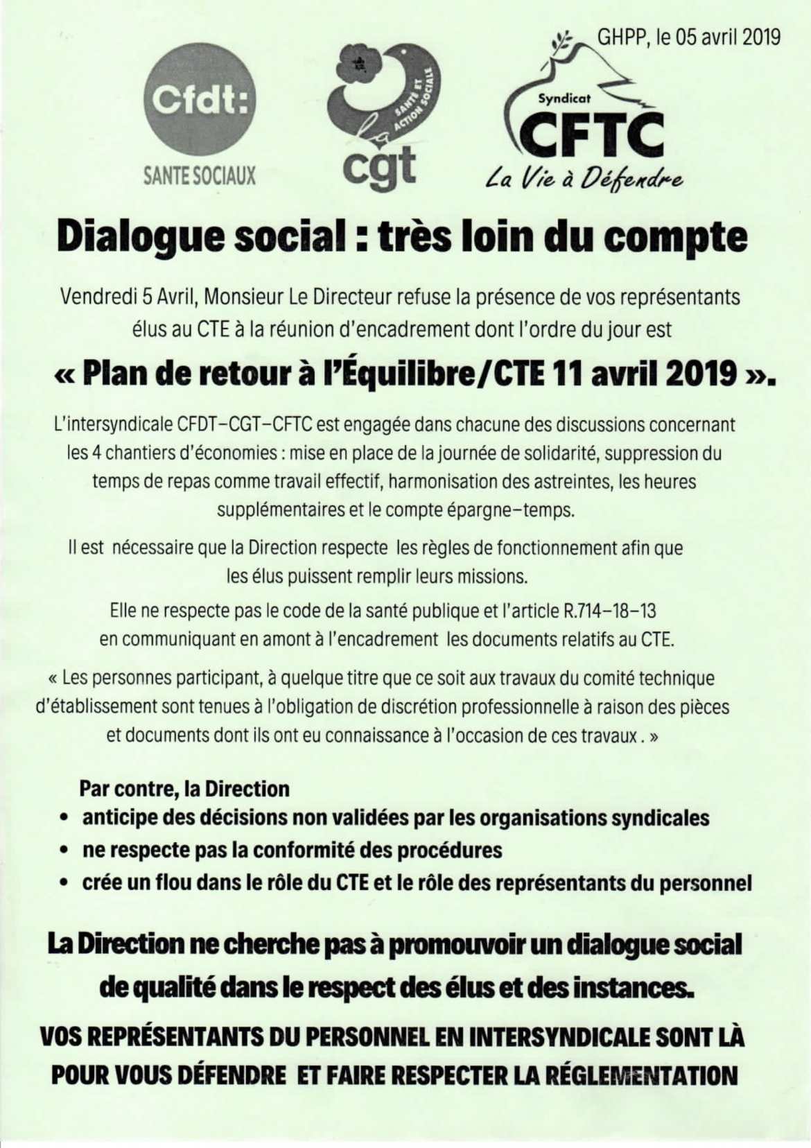 Les OS (Organisations Syndicales) ont eu vent que se tenait le 05/04/19, une réunion des Cadres, pour présenter un PRE (Plan de Retour à l'Equilibre) avant même que celui-ci ne soit présenté en CTE (Comité Technique d'Etablissement). Ainsi, elle présente le plan déjà en perspective d'application, alors qu'il n'est pas décidé qu'il doit l'être !!!… d'où un défaut de procédure certain.