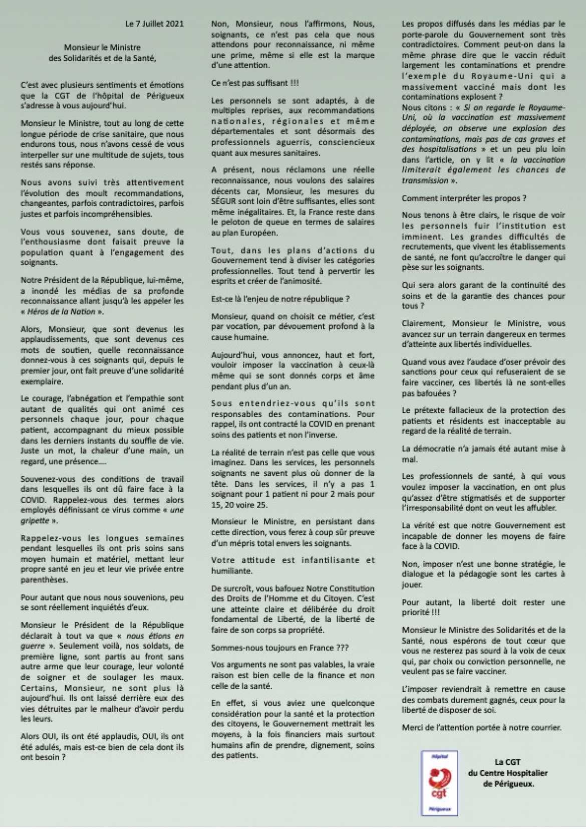 des Solidarités et de la Santé,C’est avec plusieurs sentiments et émotions que la CGT de l‘hôpital de Périgueux s’adresse à vous aujourd’hui.